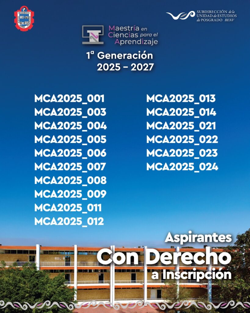 La Subdirección de la Unidad de Estudios de Posgrado tiene el agrado de compartir los folios de aspirantes con derecho a inscripción a la Maestría en Ciencias para el Aprendizaje correspondientes a la Convocatoria 2025.